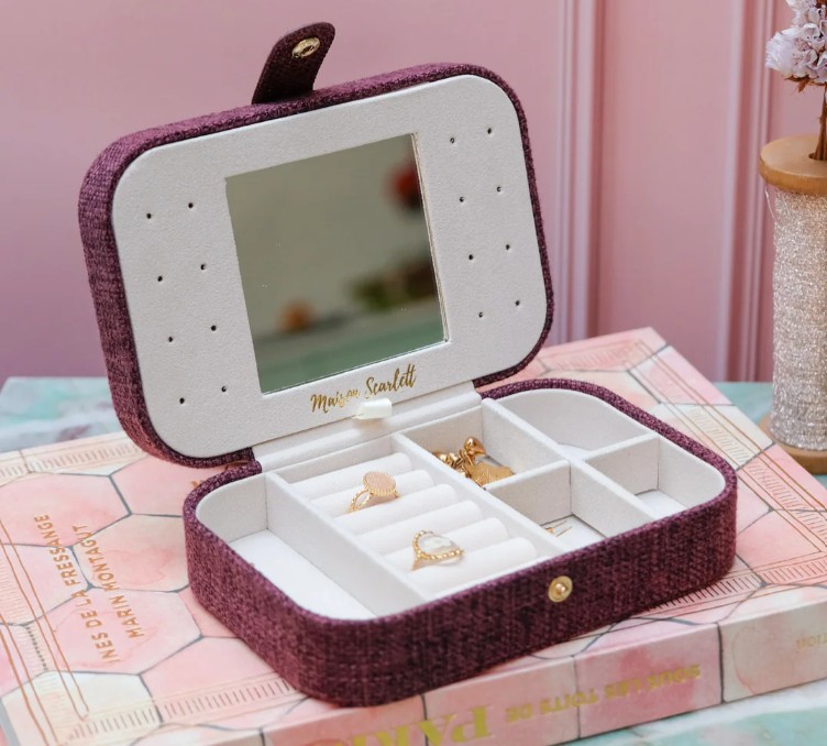Agrémentée d’un petit miroir , la « Brigitte » est idéal en idée cadeau !! A offrir en toutes circonstances , elle offre des emplacements suffisants pour l’emporter avec vous lors de vos séjours . Compacte et pratique , elle est aussi très esthétique !! Le revêtement intérieur est en velours très doux et un miroir vient compléter l’ensemble !